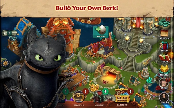 4、游戏里龙是主要收集材料的途径,所以要大量收集鱼、和木材,必先要有龙,那么要如何获得龙?游戏一开始就配给了可爱的无牙(Toothless),无牙是负责寻找龙蛋的,根据无牙的等级,可以找的蛋的种类也会逐渐增加。找来的龙蛋放到孵化炉处孵化,就可得到相应的龙。不过无牙不是每次都能带回龙蛋的,有时候是木材,有时候是鱼。
