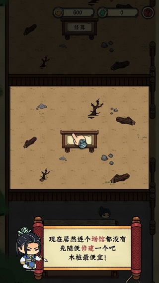 先从最基础的做起,先修建一个木桩场馆,点击图中所示的位置,进入武馆修葺,最初先来一个木桩馆。