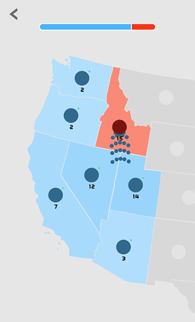 3、游戏之初,玩家会有少数已占领的领地,可以源源不断的生产出士兵,通过积攒士兵以及对地方操作的判断,在保住自己已占领的领地的情况下,合理出兵进行攻占敌方领地。