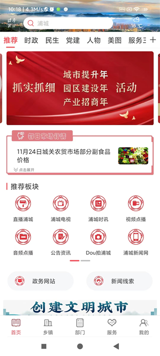 诗画浦城app是由浦城县融媒体中心推出的一款集新闻资讯、政务服务、法律在线、广播电视于一体的智能化平台,同时也是专为浦城的朋友们量身打造的本地新闻资讯服务平台。现阶段,它是以“互联网新媒体”为载体、以“专业新闻资讯”为核心所打造的,不仅提供了海量新闻资讯,而且还能让每一位用户及时了解到浦城各个方面的发展情况,其中包含了:时政、民生、党建、文艺等不同方面的新闻,让用户紧跟时代潮流。