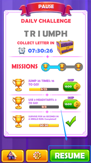 7、休息够了可以点击“resume”继续,从暂停时的位置继续奔跑,分数也不会减少