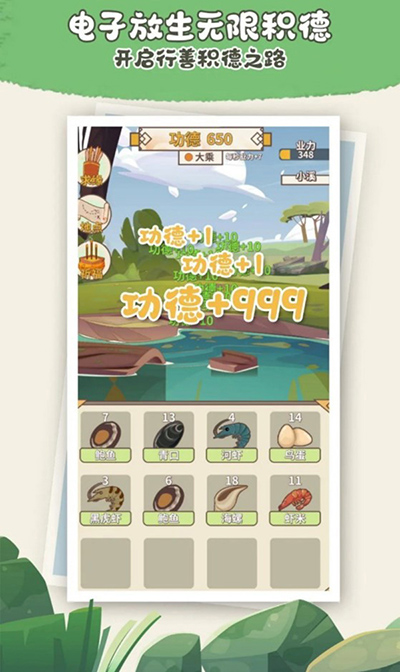 电子放生是一款非常有趣的休闲放置类游戏,在这里玩家需要通过点击来获得功德,同时在获取功德时还需要保护环境和放生流浪动物。游戏中有许多互动挑战,带来精彩多多的冒险闯关,玩家化身为一位善良的放生者,将自己的鱼类放生到适合的环境中,同时清除危害环境的物品,保护环境。随着等级的提升,玩家可以解锁更多玩法,享受更多乐趣,快来下载电子放生,舒展身心,体验放生的乐趣吧!