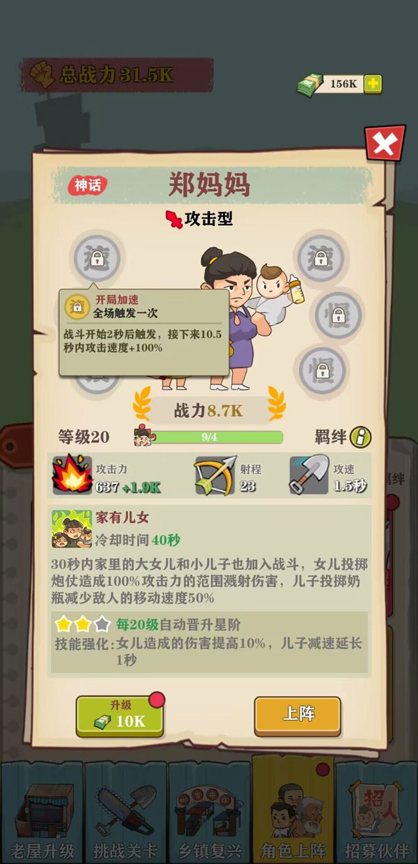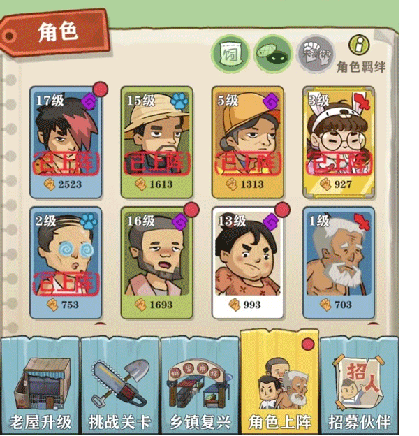 当然,不同角色之间也是有一股神秘的能量—羁绊。村名之间相互配合实力会大幅提升,比如郑妈妈和送水工邓哥就有养家糊口的效果,大幅度减少技能冷却时间,一人赚钱养家,一人在家带娃。