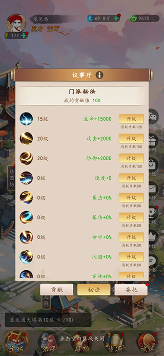 6、这是主城的议事厅,贡献能获得贡献值,然后可以升级秘法,前期就升生命攻击和防御,提升很大