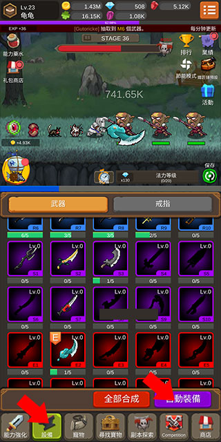 4、抽取到的装备可以点击【设备】按钮并点击自动装备即可为英雄自动穿戴当前最强大的装备,宠物同理