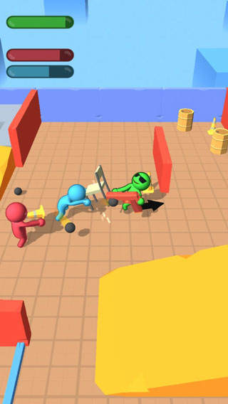 游戏的操作很简单,通过触摸屏幕就能移动角色,长按可以抓取道具攻击敌人,血条见底就算输。最让我觉得有意思的是游戏的布娃娃物理机制,打斗起来特别搞笑,而且各种奇葩武器和皮肤设计也让人忍俊不禁。此外,还能通过升级提升攻击力,解锁更多离线收益,让战斗变得更轻松。