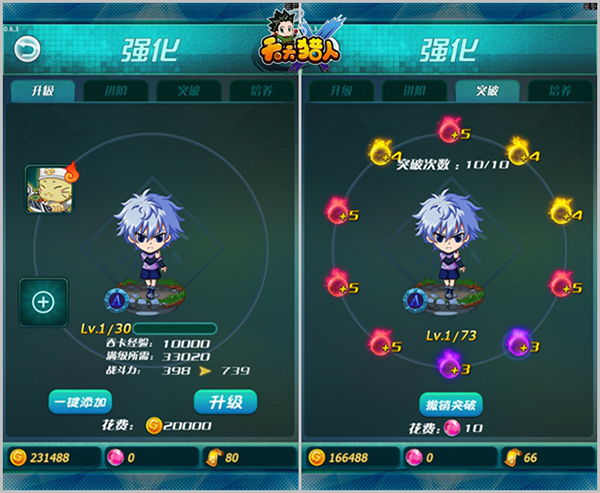 啊咧?小编为何要把这两个系统放在一起说呢,因为这是分不开的两个系统呢。卡牌升级是增强战斗力的一个重要的途径,每张卡牌一开始最高能升到30级,这里都没什么难度。但是随着你的用户等级提高,卡牌的等级也需要随之而增加了。突破可以帮助玩家达到等级直升的效果。可是突破的等级数是有一定的概率的,A卡第1、2次突破只要5000戒尼,撤销突破只要2个钻石/礼券,在这样低消耗的情况下尽量将突破做到最大等级5,这样卡牌的等级上限就能轻松达到40级了。S卡也可以以此类推,在消耗最低的时候尽量将等级突破到最大。突破数量只有10次哦,而且要非常慎重的考虑前面的几次突破等级,否则想要退回来又是不少的戒尼和钻石的消耗呢。