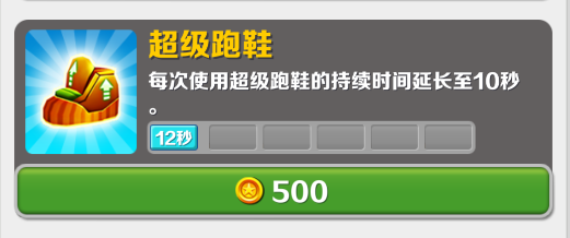 获得运动鞋后,在道具有效时间内,可以跳得比平常高。如果玩家跳的时候头碰到天花板,又没有使用滑板,游戏将会完结。