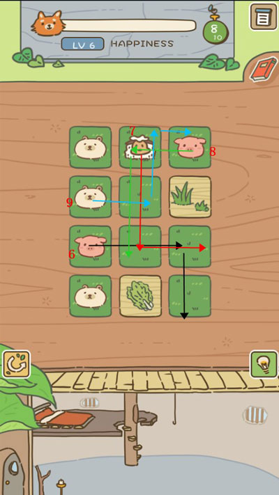 7、小羊挪到下面的小猪上面,就是草的下面。