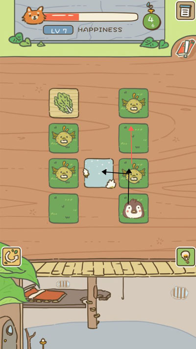4、然后我们把小企鹅挪到中间冰块,左边下面的鱼人向上一格就好了。