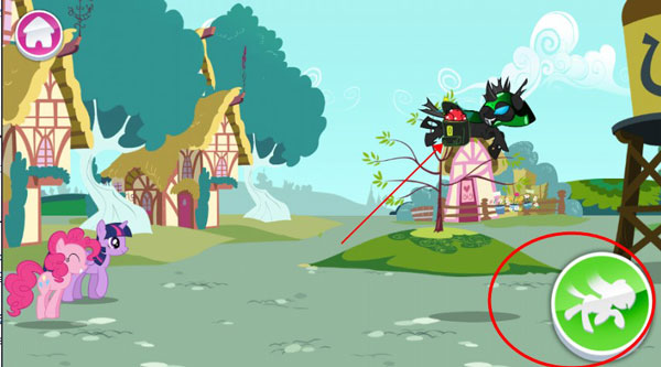 2、进入关卡后,点击右边的奔跑按钮操控小马去追逐恶魔,夺回被偷走的物品