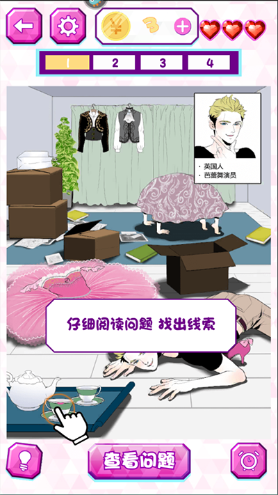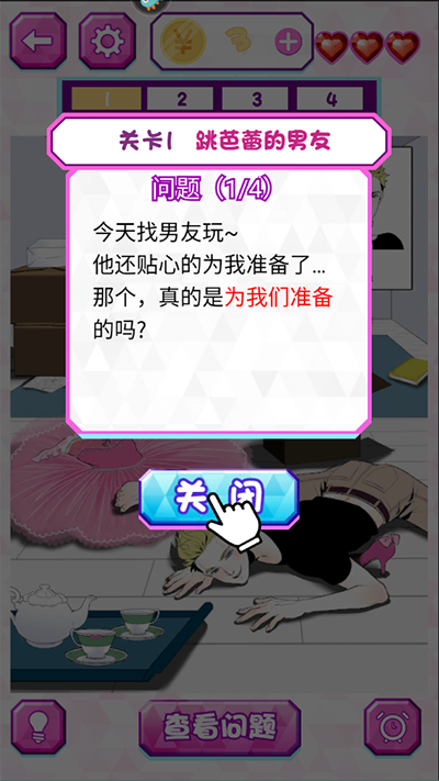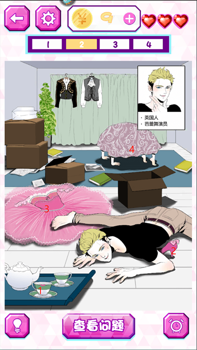 跳芭蕾的男朋友,问题1选择带口红的杯子,问题2选择高跟鞋,问题3现在芭蕾衣服,问题4选择右上角的人;