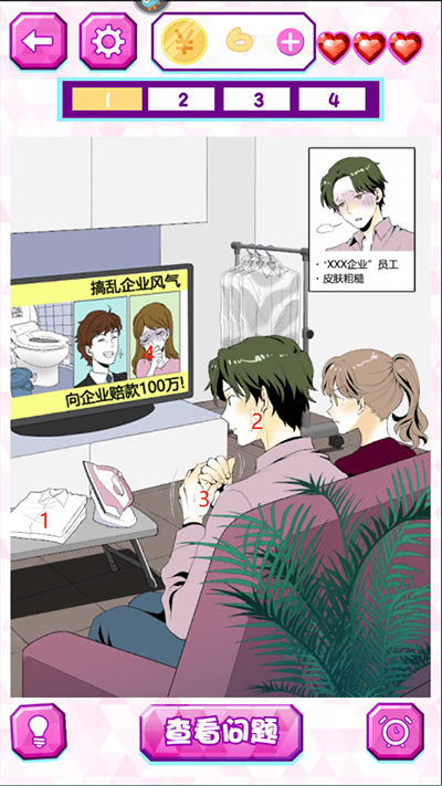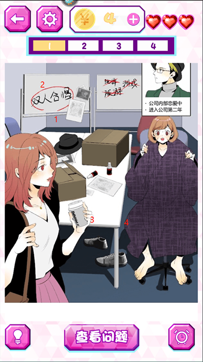 劈腿男朋友不仅将考验你的智力,还将带给你一段引人入胜的恋爱冒险。在游戏中,你需要通过解谜来了解男主角的心思和秘密,揭开他与其他女性之间的关系,你需要观察细节,收集线索,进行推理和分析,才能逐渐解开谜团,这个过程不仅考验你的智力,还需要你运用自己的情感和直觉来做出决策。准备好挑战你的思维和情感吧,展开这个充满未知和悬疑的恋爱之旅!劈腿男朋友手机版将带给你一段令人难忘的游戏体验,让你沉浸在一个充满浪漫与冲突的恋爱世界中,快来下载并开始你的冒险吧!