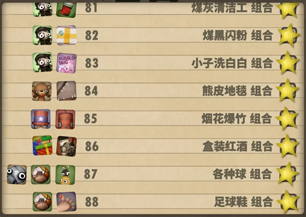 十、73—80组合:喷云吐雾链条组合:Drill Chain Thrower(6) PuffPack(6);致命恶习组合:Midlife Crisis Mitigator(3) Glass Cards(6) Puff Pack(6);注射组合:Snake Surprise(2) Protein Powder(6);健美组合:Manly Trophy(6) Protein Powder(6);震耳欲聋的组合:Valkyrie Doll (2) Sonic Boombox(6);狂飙组合:Wooden Bicycle(1) Celebration Bus(1) Mustache Rider(6);患病的组合:Toy Leperchaun(2) Mystery Seasoning(3) Book of Darkness(6)