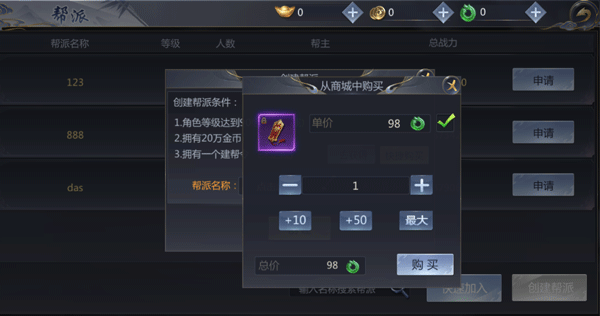 点击创建帮派的提示窗口中的快捷购买按钮,系统会弹出快捷购买页面,直接勾选道具,点击【购买】,即可获得道具【建帮令】。