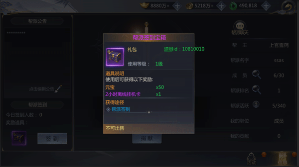 签到成功后,可以获得帮派每日签到礼包,里面包括:【2小时离线挂机卡】、【九转续命丹】、50元宝。