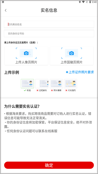 5、进入实名信息界面,输入真实姓名、身份证号码、上传证件照片,点击【确定】。