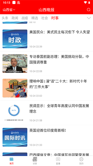 1、下载安装好打开app,在首页中我们可以看到头条、政闻、战役、精选、社会、时事等。
