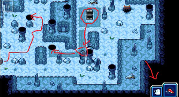 还是第三层,最下面那个冰场一开始是过不去的,走右边那个梯子,上去之后就有个箱子,技能换成:推,按图示把石头推下去才能过关第三层那个冰场。