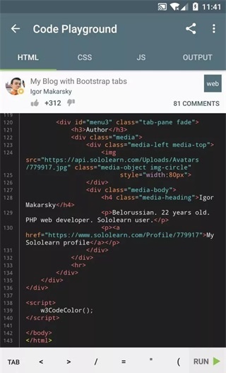 光学习是没有用的,实践更重要。然而,手机上“实践”——调试代码是一件非常蛋疼的事情,因为环境难以配置,除了使用 Termux 之类的终端应用别无他法,体验又上不去。但是,SoloLearn 的 Code Playground 功能很好的满足了手机上“实践”的需求(这里使用别人的代码做演示)。