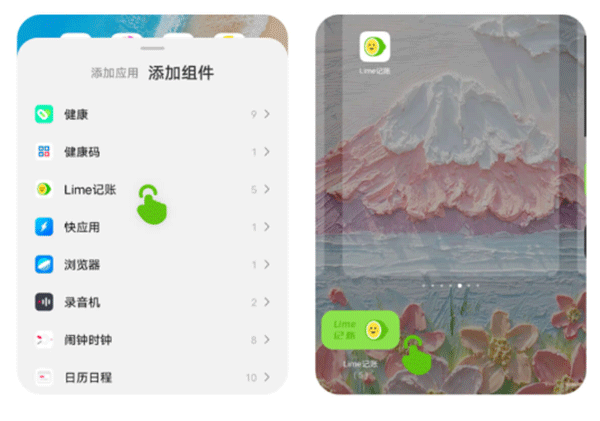 操作方面,添加组件到桌面也很简单:长按或双指捏合桌面空白区域,在“添加组件”中找到软件的小组件,选择大小后拖到桌面上保存就行。总的来说,Lime记账功能强大又不复杂,无广告的良心设计让人好感度倍增,值得一试!
