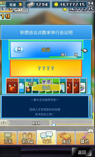 如果点子数量足够的话那就多去制作,大家可以从里面获得很不错的点子哦,这都有助于后期游戏的研发。如果点数不够的话,可与进行开发或是使用道具,会议点数就会增加哦。