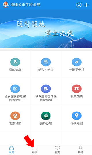 1、下载并打开福建税务app,点击下方导航栏的办税按钮