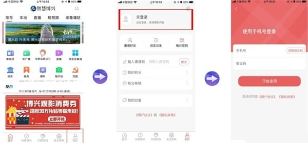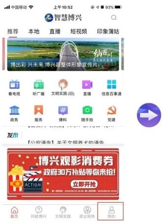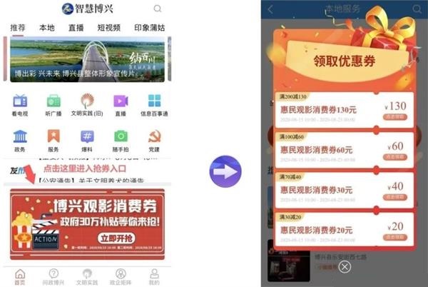 1、打开智慧博兴app首页,点击“博兴观影消费券”图片进入。
