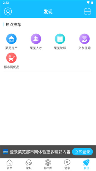 2、会看到首页、论坛、都市圈、消息、发现五大板块,其中在首页中功能最全,包括莱芜杂谈、二手市场、房屋凭售、求职招聘、亲子乐园、游山玩水等功能;