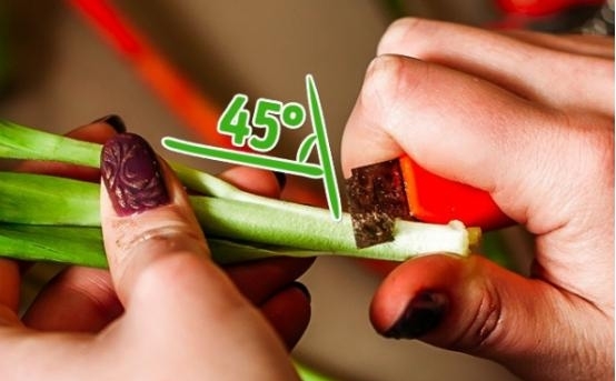 为了鲜花能保持新鲜,我们需要定时修理花茎。使用 锋利的刀,修剪茎 的时候保持 45切角。这能帮助增加花朵 吸收水的能力。通常我们在花店买来的鲜花最好修剪之后立即放置在水里。