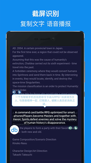 DB翻译官方版又叫DB翻译器,它是长沙彬云科技有限公司为手机用户开发的一款多语言屏幕翻译工具。这款软件采用的是OCR识别屏幕文本技术来实现一键翻译,相比传统的输入文本翻译,其内除了拥有悬浮球功能,还能够支持用户自主设置双击、长按等快捷指令,更快速直白的为用户提供准确翻译内容,且还兼具了灵活翻译部分的特点!例如,我们在浏览网站或者玩英文游戏的时候会遇到那种全是外国语言的界面,导致我们看不懂内容,一句一句去翻译又太浪费时间,这个时候就可以使用DB翻译来轻松完成界面翻译,让你可以无视语言障碍,轻松了解各种信息!