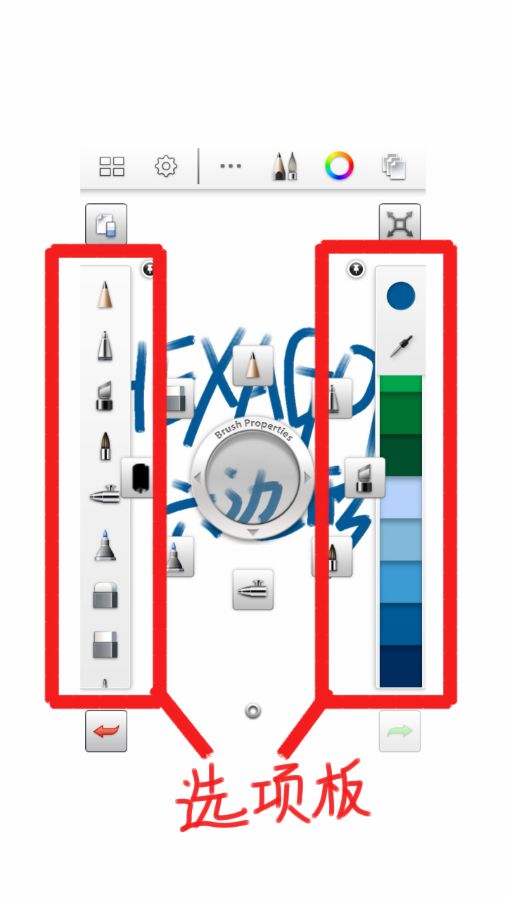 为了接下来的说明中表达清晰,我把软件分为了几个部分,分别是: 工具条,图层,环形菜单,选项板,角落按钮,画布。