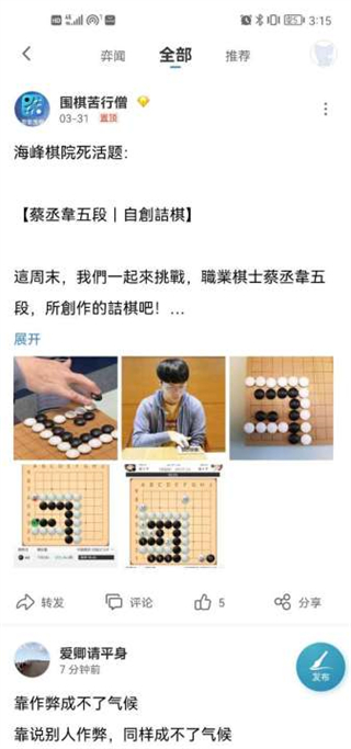 5、然后我们在棋圈中还可以看到发的残局和动态;
