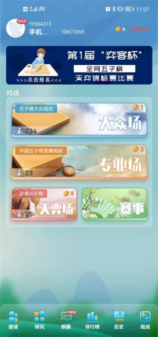 1、首先我们进入弈客五子棋手机版游戏,我们可以先进入大众场;