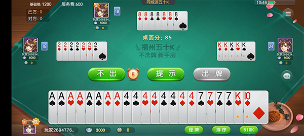 同城游五十K手机版是一款超好玩的扑克牌游戏,支持多人在线对战,还能和全球玩家互动聊天,特别适合喜欢竞技和社交的玩家。这款游戏有很多玩法,比如不同地区的规则、加倍不洗牌等,每次都能带来新鲜感。最让我觉得方便的是它的理牌功能,一键整理特别快,节省了很多时间。