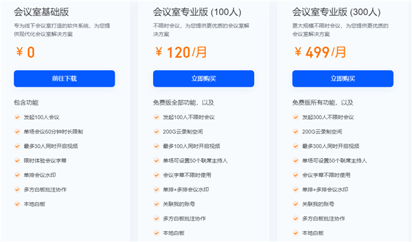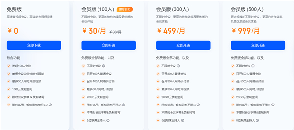 针对于不同会议人数以及条件需求,腾讯会议App2025最新版推出多种服务,您可以根据需求进行选择购买使用,从而帮助会议正常进行。需注意的是,自今年4月份腾讯会议不再开放个人免费300人会议人数,修改为100人,会议时间从45分钟升至60分钟。