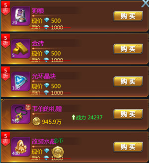 然后就是每日限购,那必须是铸造晶石、狗粮、钢铁羽毛、电子元件、战兽激素、光环晶块等等。如果钻石不足,那么建议优先购买狗粮和钢铁羽毛,这两个分别提升宠物和羽翼的,每进阶一次都可以给角色提升很大的战斗力。有时候还会刷出一些打折的材料,像钢铁羽毛、脑力因子之类的,只要是不高于五折,都可以购买,毕竟半价购入这些材料还是非常值的,所以就不要吝啬您的钻石咯。