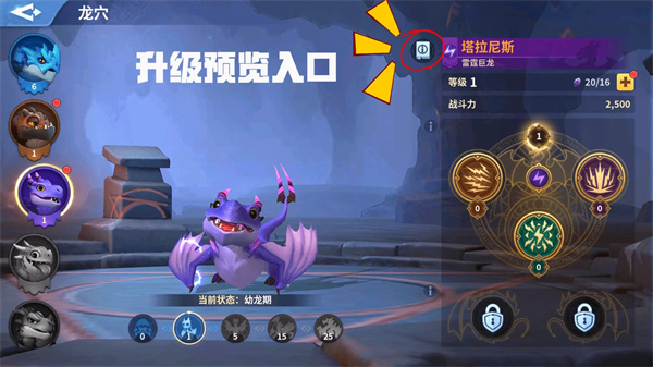 巨龙5级时将解锁主动技能(龙之吐息)槽位,5、7、15、25、35级时分别领悟一个新的主动技能。10级时将解锁被动技能(龙之威慑)槽位,10、12、20、30、40级时分别领悟一个新的被动技能。在龙穴内点击巨龙右上角的书本提示按钮可以查看巨龙的升级效果预览。