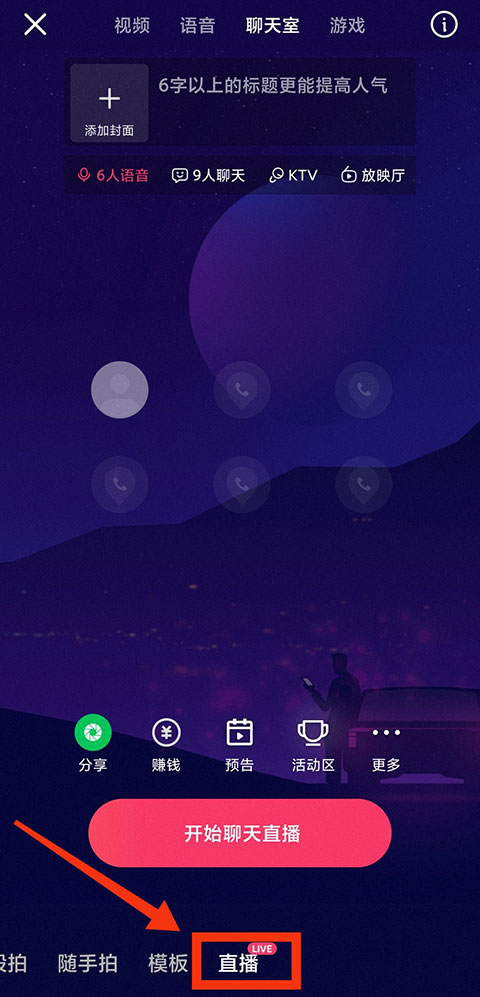 4、然后点击正下方的【+】按钮,并滑动至右侧的【直播】版块即可开始直播了。