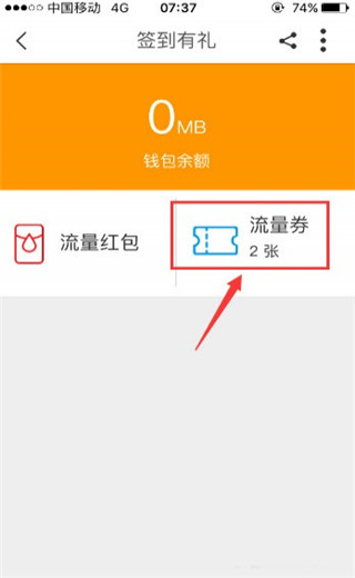 点击“我要兑换”按键后,在新的页面中我们可以看到当前流量券的数目,我们点击“流量券”图标。