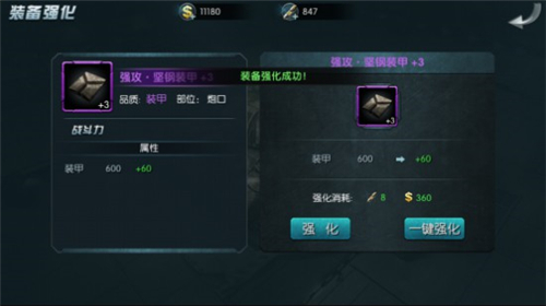 简单来说是一个用装备养装备的过程。装备的强化100%成功,但强化过程会消耗金币和强化点数。强化等级越高,所需的金币和强化点数就越多。这里面的强化点数是如何获得的呢?所有的装备分解之后都会获得强化点,因此大量的分解装备才能保证目标培养装备所需的强化点数。因此,装备强化是一个用装备养装备的过程。