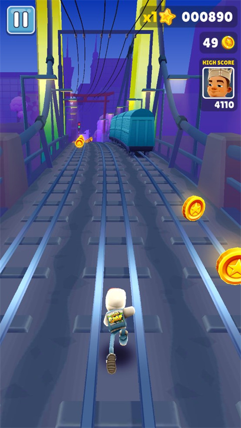 通过双击屏幕来启动滑板,滑板会持续一段时间。在没有滑板的情况下,角色撞到火车或者障碍等都会被**抓住,游戏终结。但在有滑板的状态下,角色就有了一道保险,撞到火车等的时候,滑板会消失,游戏可以继续进行。