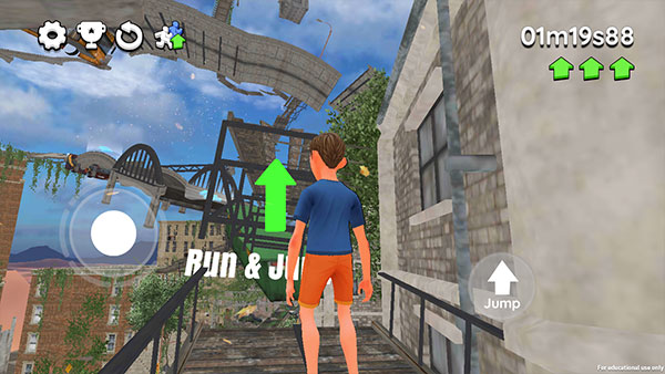 2、左下角移动,右下角“jump”跳跃,滑动屏幕可以旋转视角方向,开局沿着地面上的淡绿色荧光标识走。