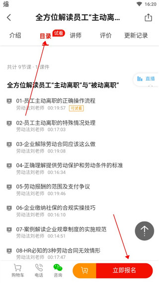 3、点击目录可以查看这个课程下的所有内容,感觉合适的话可点击下方的【立即报名】。