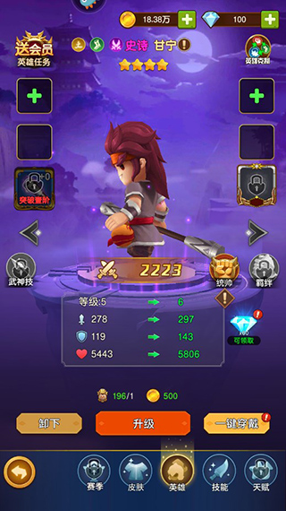 玩家在通过第五关之后可以解锁英雄,点击下方英雄按钮即可进入,可以给英雄升级、学习技能、换皮肤等。
