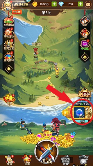 玩家点击中间开战按钮,即可进入战斗界面,可以进行排兵布阵,之后点击交叉剑图标即可开始闯关。