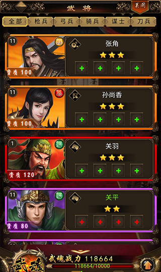 玩家进入武将页面,可以查看自己拥有的武将,帮他们提升等级以及进阶等