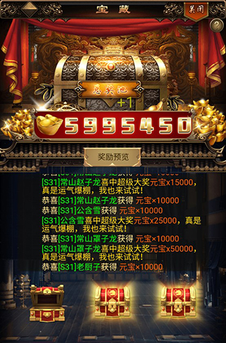 玩家点击上方的宝藏,即可进行宝箱的开启,消耗一千个元宝开启宝箱,内含丰富的道具,每开启一个宝箱都会增加需要开启的元宝数量,越到后面奖励越丰富