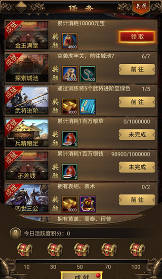 玩家点击右下方的任务,即可领取任务奖励,完成任务可以获得成就,每达成一个成就都会获得相应的奖励