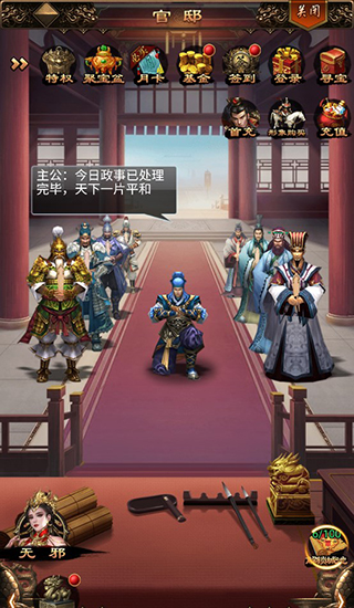 玩家点击下方的主公,即可进行政务的处理,处理政务可以获得政绩,可以用来提高自己的爵位